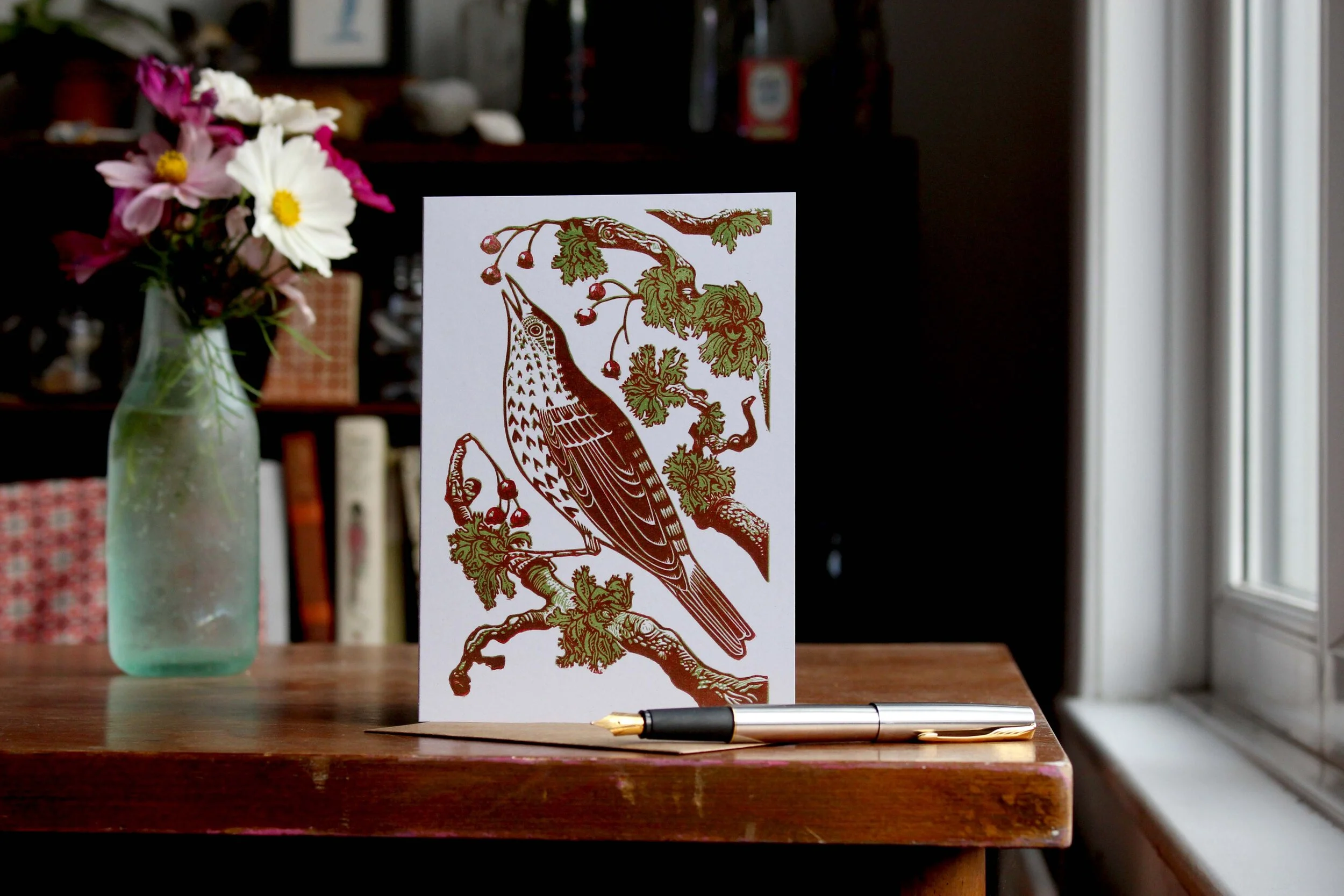 Walking along the riverside path one day in January 2020, I noticed that the ground was littered with plump, fresh, red hawthorn haws. I wondered why so many berries still remained on the hedges in the dying days of winter, so I went home and looked it up: hawthorn haws are mainly eaten by fieldfares and song thrushes, which are migratory. So the bush produces its bounty in late summer and autumn, and holds on to it right the way through winter just so that the song thrushes and fieldfares have a feast to return to. I thought that was a bit magical, and took the colour palette of rich red berries and fresh green lichen as inspiration.