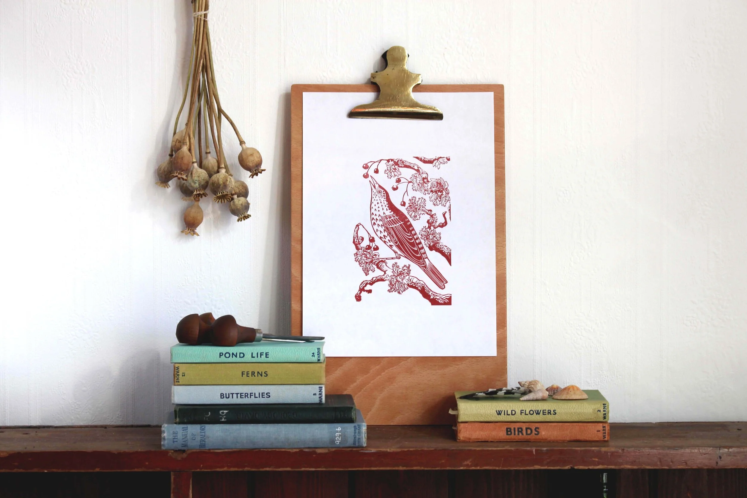 During the process of making this print, I also discovered that there are British folk tales associating the song thrush with weather prediction, especially storms and high winds. Connecting this with the notion of the song thrush’s arrival being symbiotic with the appearance of spring, and after the severe storms of February 2020 in the UK, the name Forecast - Spring seemed natural.